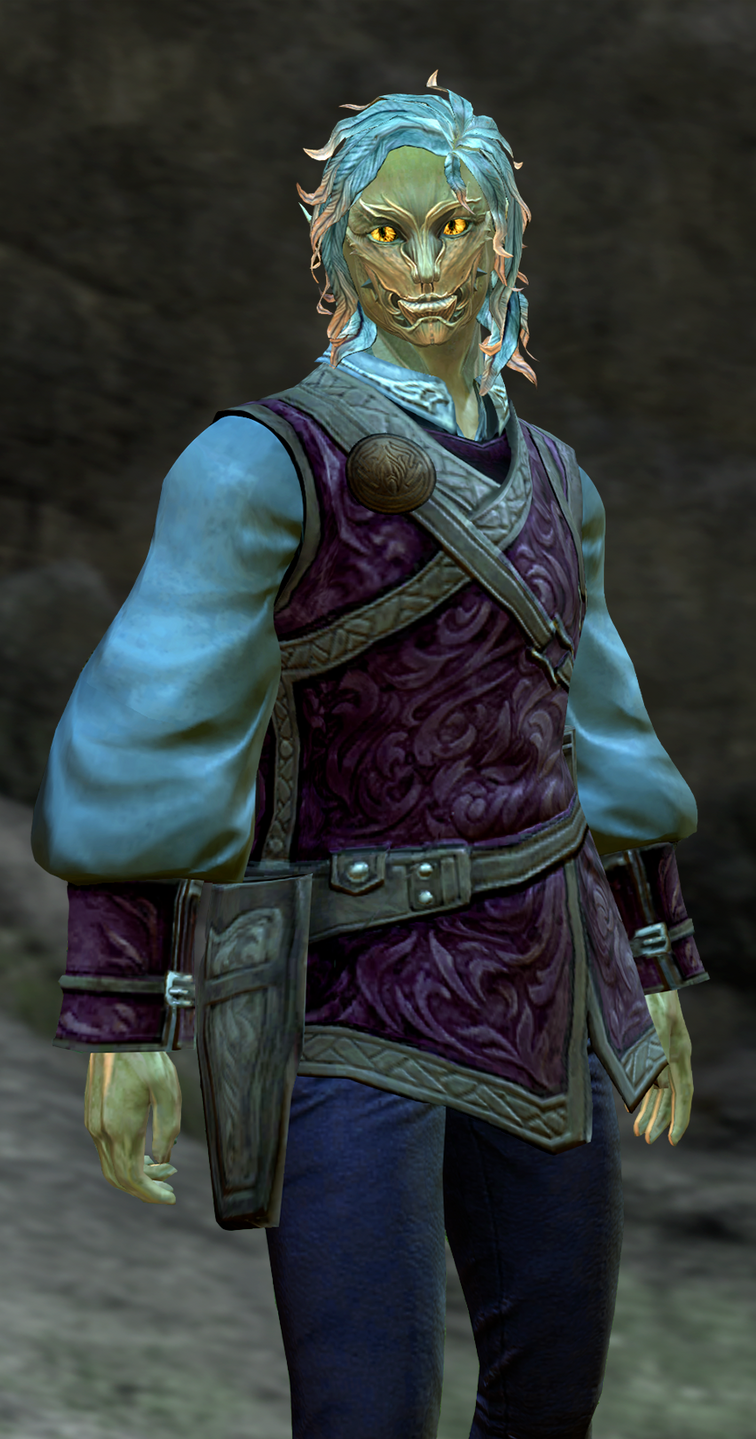 | This sylvari stands out through a small collection of body mods which are rather subtle. Most obvious are the dark sclera and lines along his eyelids. Through his ears are chains hanged symmetrically, in the centre of his lower lip is a labret with a chain, and his tongue is pierced as well. |
