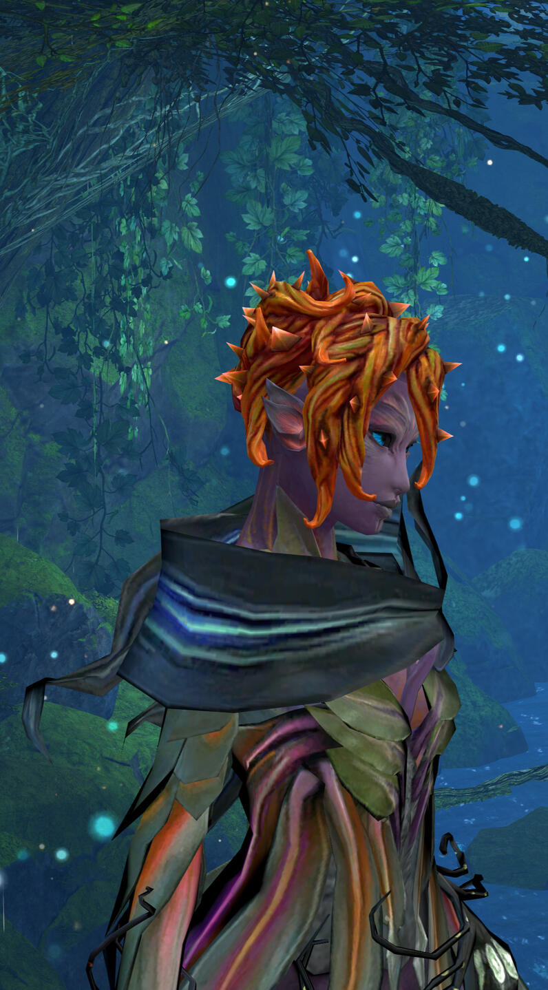 | Rumour has it, this sylvari got lost in the Mists for a while, and returned differently. Notably, stripped of most memories. |